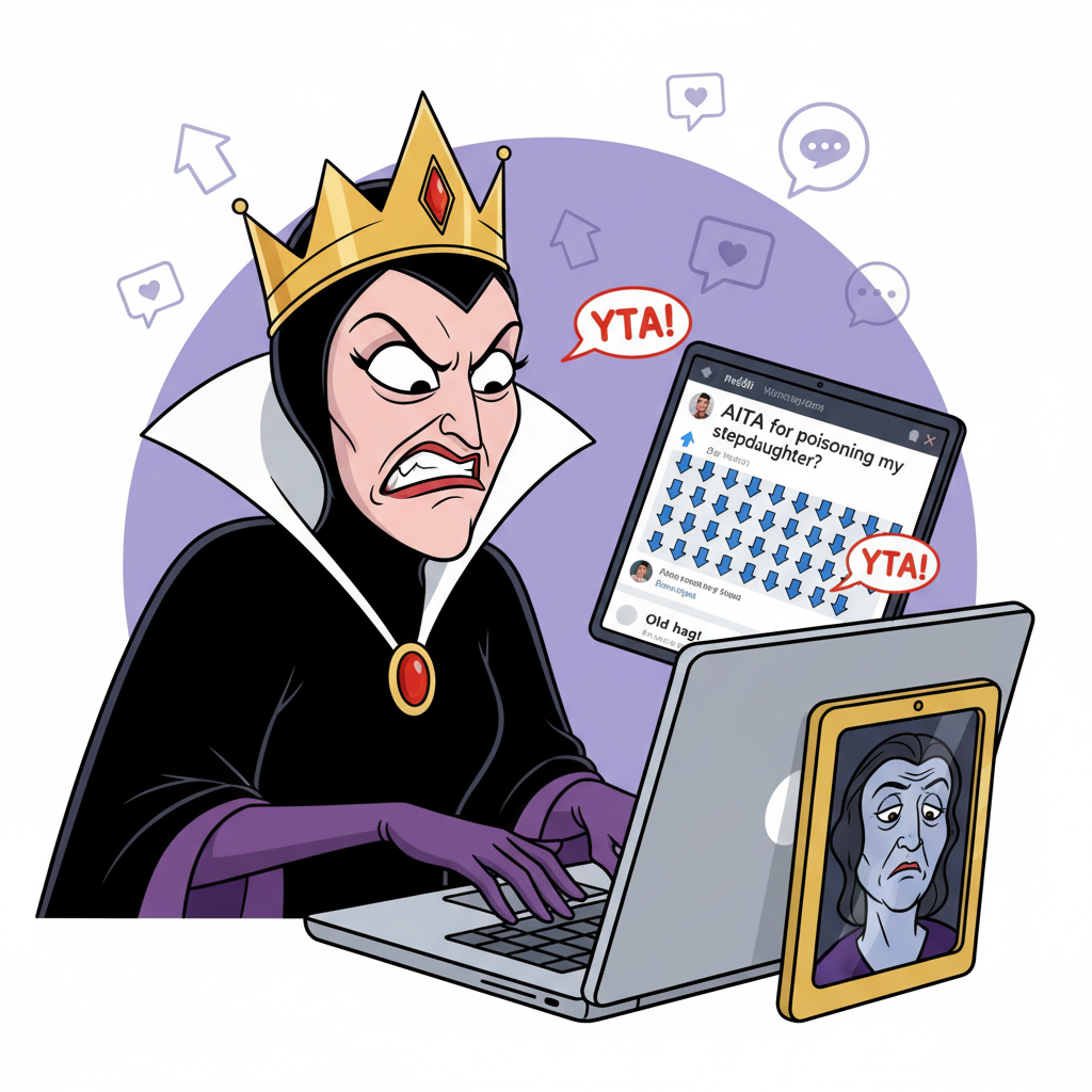 Here’s where I might be the asshole: I’ve been gently suggesting that Snow could benefit from some improvements. Like, I hired a huntsman to take her on nature walks for exercise (she’s been looking a bit pale lately), and I even went out of my way to personally deliver her healthy snacks when she was staying with some friends in the forest. I brought her a beautiful organic apple – literally hand-selected and specially prepared with my own secret ingredient blend for maximum nutrition.